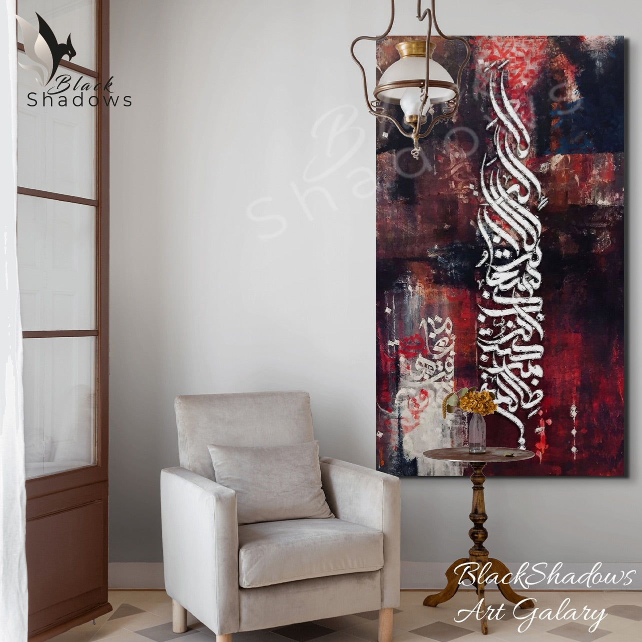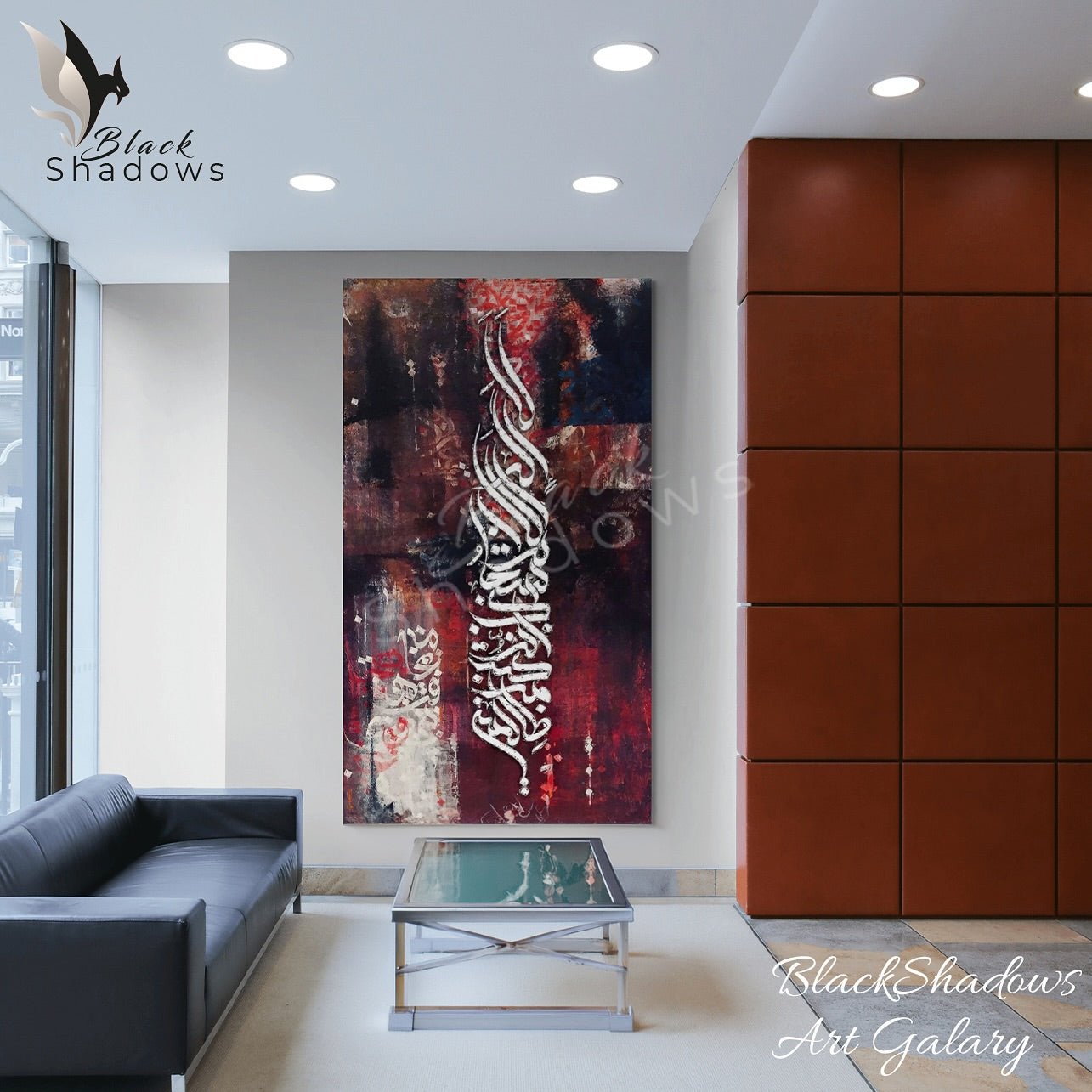تعرض هذه القطعة الآسرة جمال الخط العربي. أضف لمسة من التعبير الفني إلى منزلك الكويتي مع القطع الفنية الفريدة من Black Shadows والتسليم بسرعة البرق.